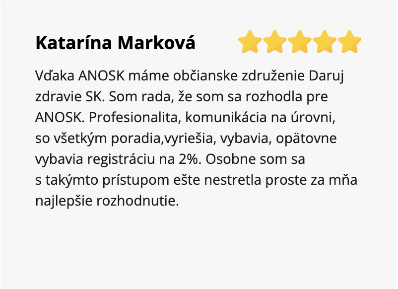 Vďaka ANOSK máme občianske združenie Daruj zdravie SK. Som rada, že som sa rozhodla pre ANOSK. Profesionalita, komunikácia na úrovni, so všetkým poradia,vyriešia, vybavia, opätovne vybavia registráciu na 2%. Osobne som sa s takýmto prístupom ešte nestretla proste za mňa najlepšie rozhodnutie.