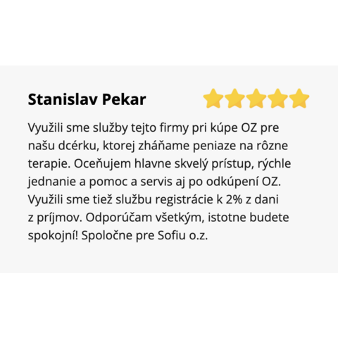 Využili sme služby tejto firmy pri kúpe OZ pre našu dcérku, ktorej zháňame peniaze na rôzne terapie. Oceňujem hlavne skvelý prístup, rýchle jednanie a pomoc a servis aj po odkúpení OZ. Využili sme tiež službu registrácie k 2% z dani z príjmov. Odporúčam všetkým, istotne budete spokojní! Spoločne pre Sofiu o.z.