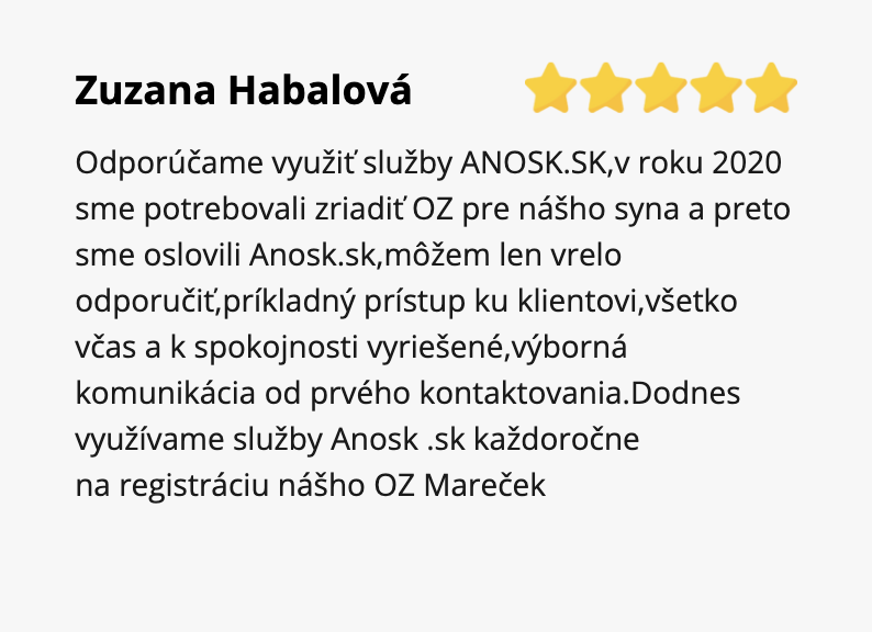 Odporúčame využiť služby ANOSK.SK,v roku 2020 sme potrebovali zriadiť OZ pre nášho syna a preto sme oslovili Anosk.sk,môžem len vrelo odporučiť,príkladný prístup ku klientovi,všetko včas a k spokojnosti vyriešené,výborná komunikácia od prvého kontaktovania.Dodnes využívame služby Anosk .sk každoročne na registráciu nášho OZ Mareček