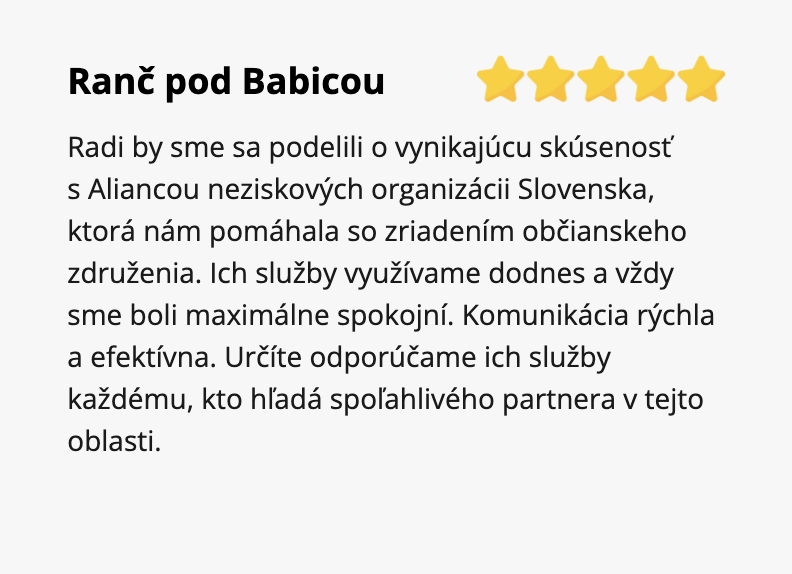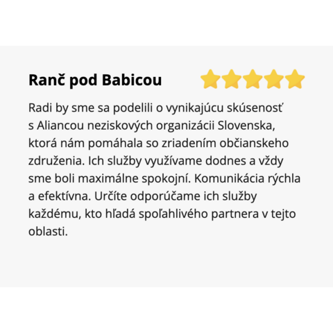 Radi by sme sa podelili o vynikajúcu skúsenosť s Aliancou neziskových organizácii Slovenska, ktorá nám pomáhala so zriadením občianskeho združenia. Ich služby využívame dodnes a vždy sme boli maximálne spokojní. Komunikácia rýchla a efektívna. Určíte odporúčame ich služby každému, kto hľadá spoľahlivého partnera v tejto oblasti.
